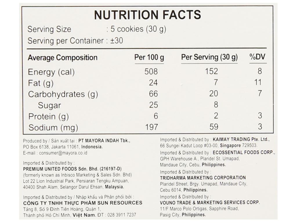 Thành phần: Bột lúa mì, đường, bơ (18.67%), dầu thực vật (chứa chất chống oxy hóa tocopherol), glucose syrup, trứng, dừa sấy, nho khô, bột sữa tách béo, muối, chất tạo xốp E503, hương vani tổng hợp